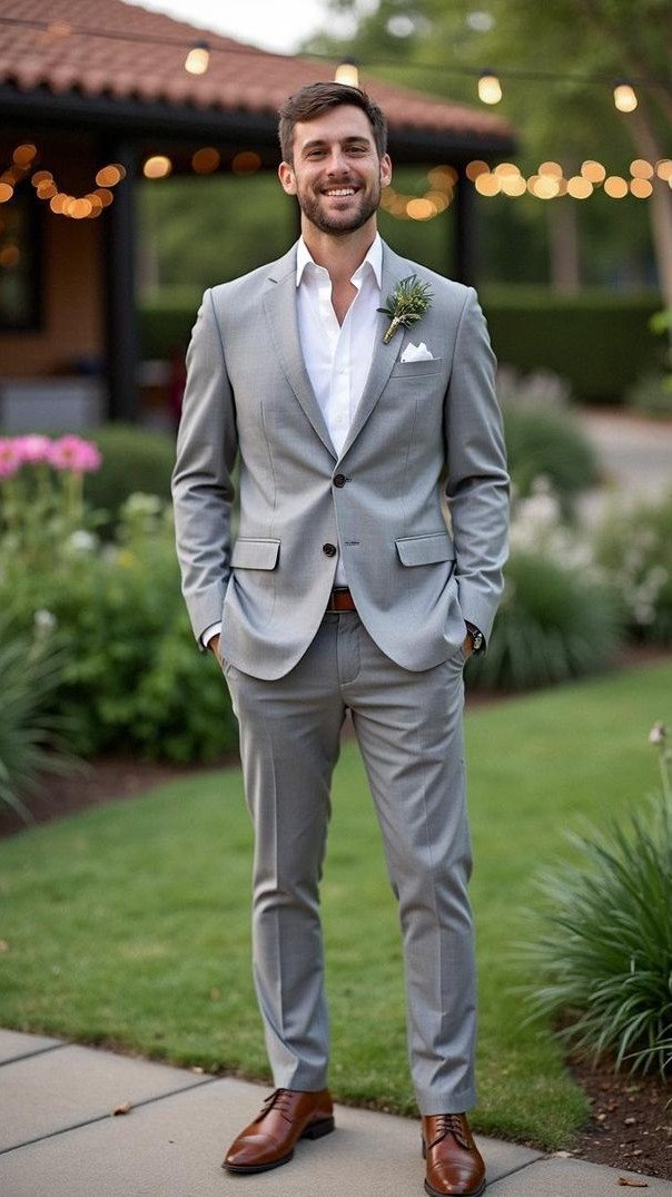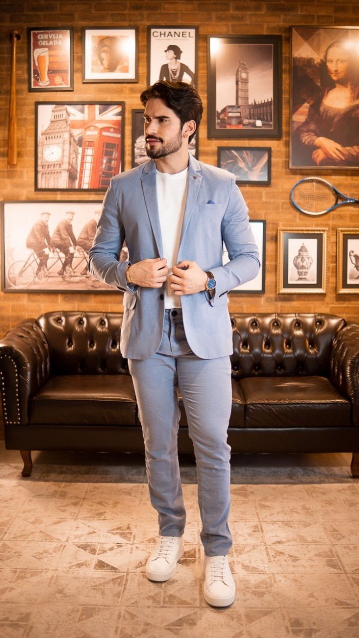 Os homens podem ir de camisa social, calça social e terno, em looks mais clássicos e sofisticados — jeans, polos e peças casuais não entram muito no clima da ocasião.